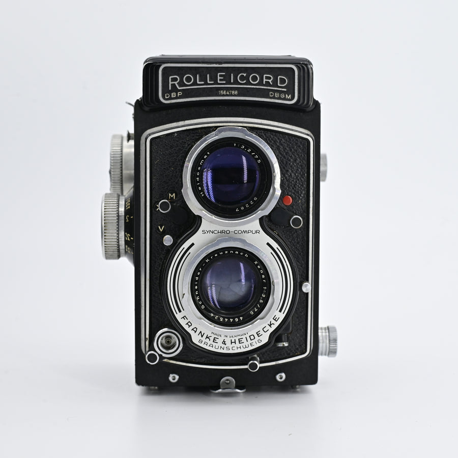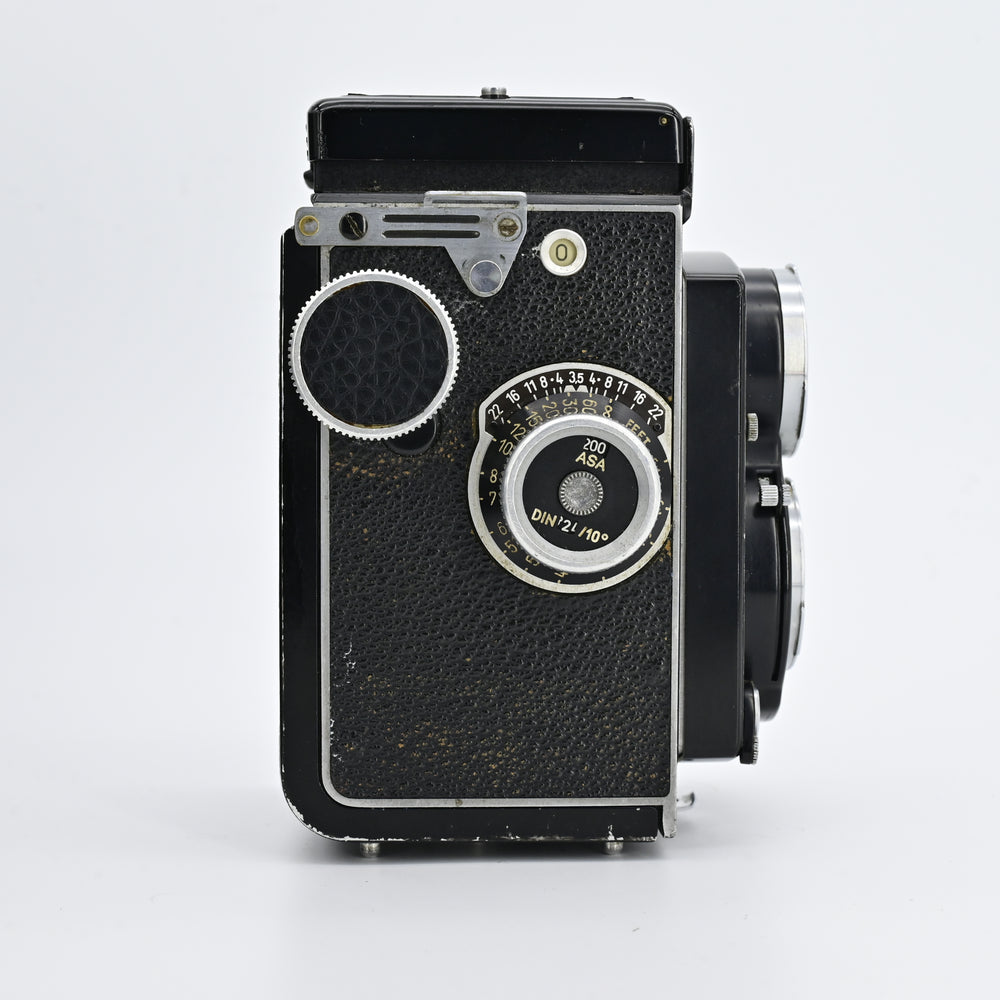 Synchro Compur MX, 1 - 1/500 sec., B, X-sync. Film: 120 for 12 exp. 6x6. 35mm adapter Rolleikin 1 and plate film adapter.